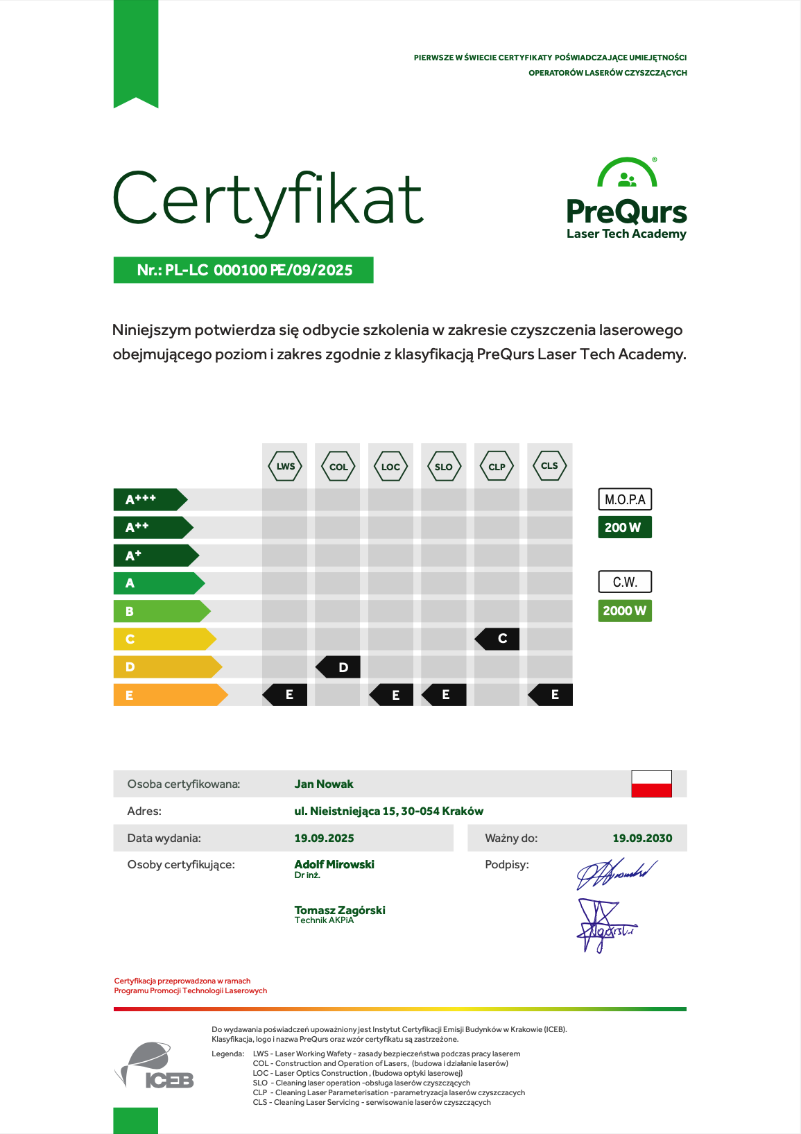 Po zakończeniu kursu każdy uczestnik otrzymuje certyfikat Laser Tech Academy, potwierdzający nabycie umiejętności i wiedzy w określonym zakresie. Dokument ten jest nie tylko formalnym potwierdzeniem kompetencji, ale również ważnym atutem podczas audytów, wdrażania nowych technologii czy współpracy z kontrahentami.